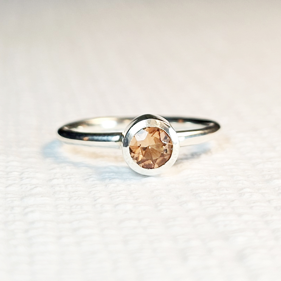 Anel com turmalina rosa alaranjada em prata. Nenhuma foto é capaz de revelar a beleza dessa gema e sua cor única! Esse é um modelo tradicional do ateliê. Seria injusto chamá-lo de anel de balinha. Quando criei o anel de balinha lá por 2010, ele tinha gemas bem pequenas, normalmente turmalinas coloridas e a maioria em corte cabochão redondo, o que me lembrava demais a fatídica bala Soft. Às vezes, também fazia alguns aneizinhos com gemas facetadas. Esse aqui tem uma turmalina no tom mais lindo de rosa alaranjado com uma lapidação impecável. Anelão! Medidas: gema 5 mm, aro fio redondo 2…
