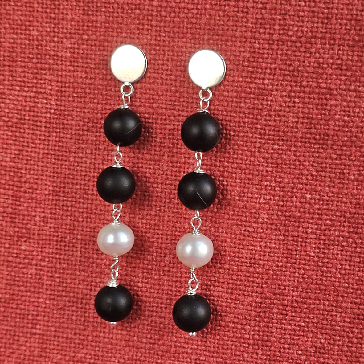 Brincos círculo longo com ágatas negras e pérolas em prata. Uma combinação de preto, branco e prata que começou a aparecer no meu trabalho. Leve e lindo! Medida 6,20 cm