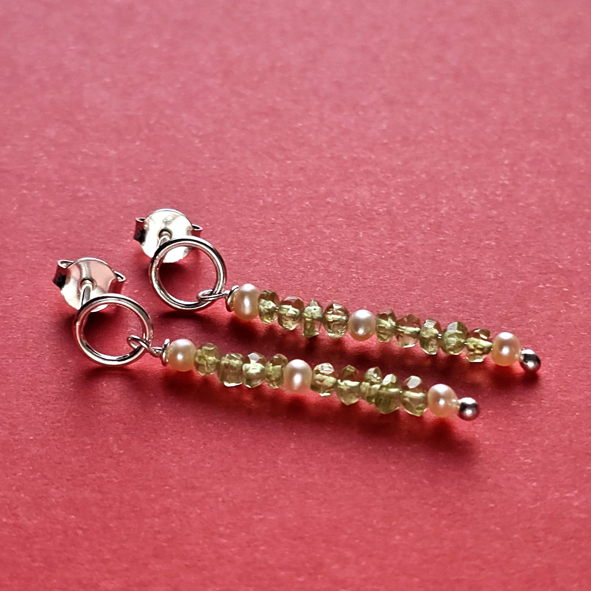 Brincos círculo com peridotos e mini pérolas em prata. Delicadíssimo, e muito leve, par de brincos com uma das cores mais queridas no verão. Não resisto a trabalhar com verde quando o verão se aproxima. Adoro! Medida 4,0 cm