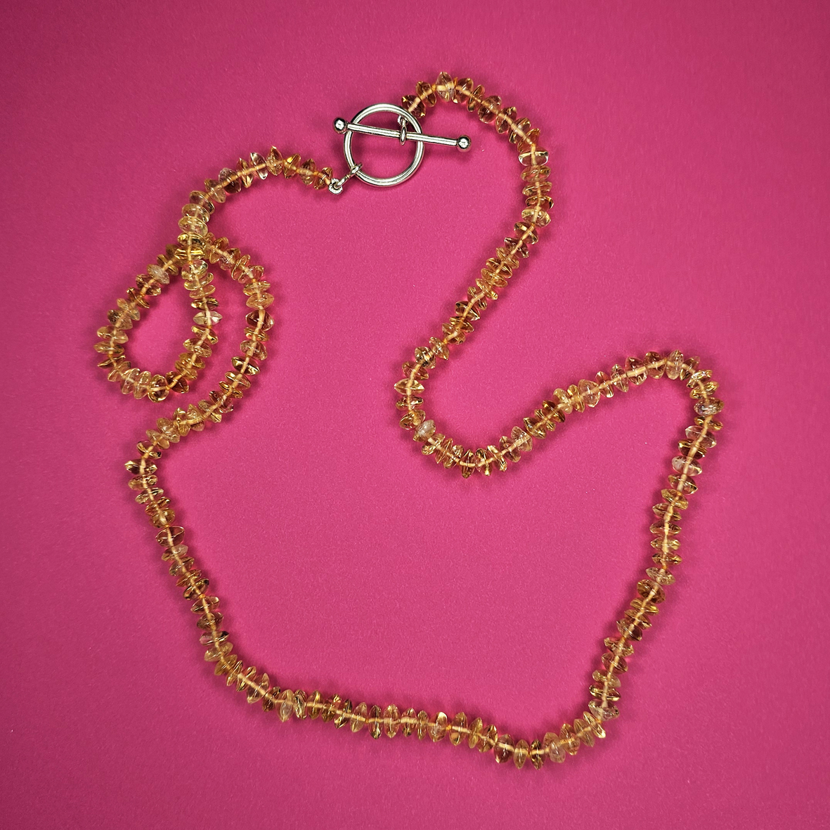 Colar com citrinos disco em prata. Citrinos com seu amarelo incrível é a cara da alegria. Há quem atribua poderes de prosperidade e alegria à cor e à gema. Eu penduro no pescoço, quando quero vibrar dessa forma. Medida: comprimento 60 cm