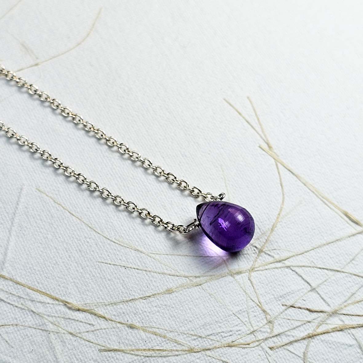 Pingente de pequena gota de ametista em prata. Uma gema linda com essa cor da transmutação e da espiritualidade. Fala se essa ametista não ficou linda nessa correntinha de elos portugueses. Medida: gema 0,9 cm, corrente 45 cm